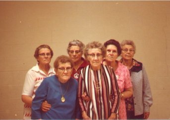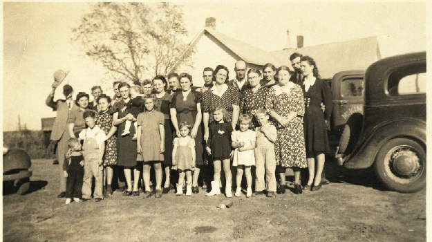 L-R Unknown Boy, Unknown Boy, Sylvia Moore, Bernice Moore (daughter of Johnnie Moore), Unknown Lady and Toddler, Jenell Moore, Unknown Lady, Unknown Lady with small child with white boots, Eva Jackson Moore, Elouise Moore with dark dress white boots, Unknown small girl and boy, Mary Kelly Moore, Barton Louise Kelly Moore in print dress with white collar, Unknown Lady. All men are unidentified but Garland Moore is possibly 3rd man from left with his face mainly covered by lady holding small toddler. |